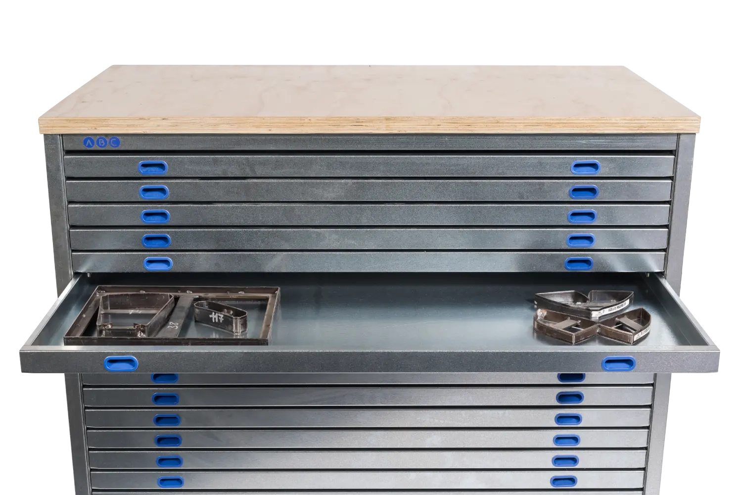 The available models are designed to fit any type of cutting dies. The cabinet always has the same external dimensions, only the size and depth of the drawers change.