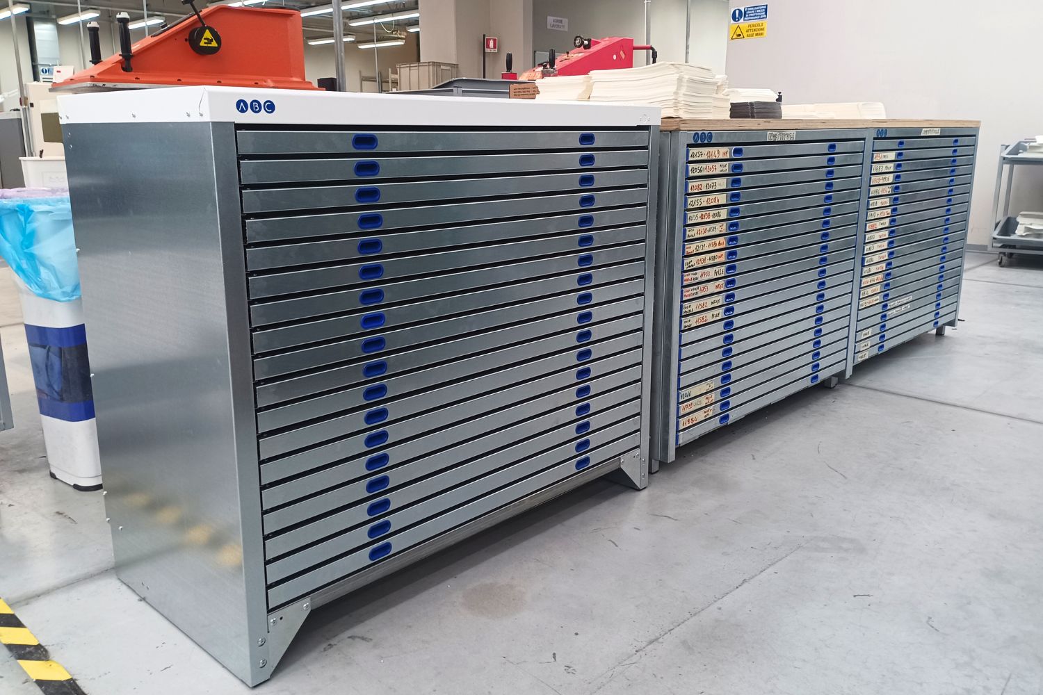 The solution is provided by the ABC cabinet, both horizontal and vertical, specially designed for cutting dies storage.