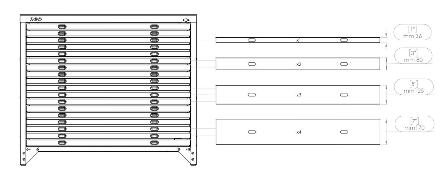 The customer’s need was to customise the drawer combination of the horizontal cabinet with dimensions 115x62xH140 cm, which is supplied with 27 drawers of 35 mm (ref. CO27_12_01). In this case, however, the customer requested two different versions: