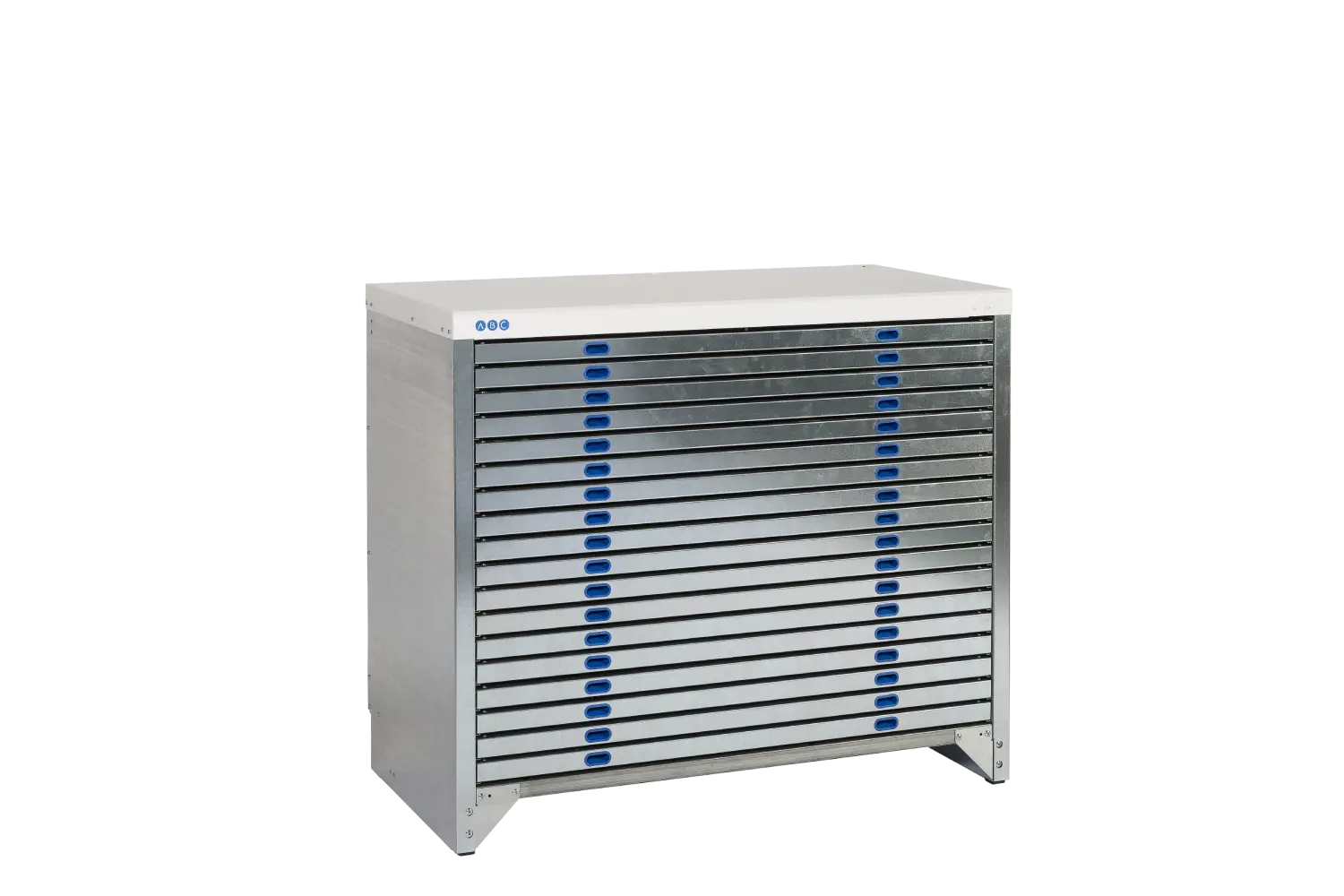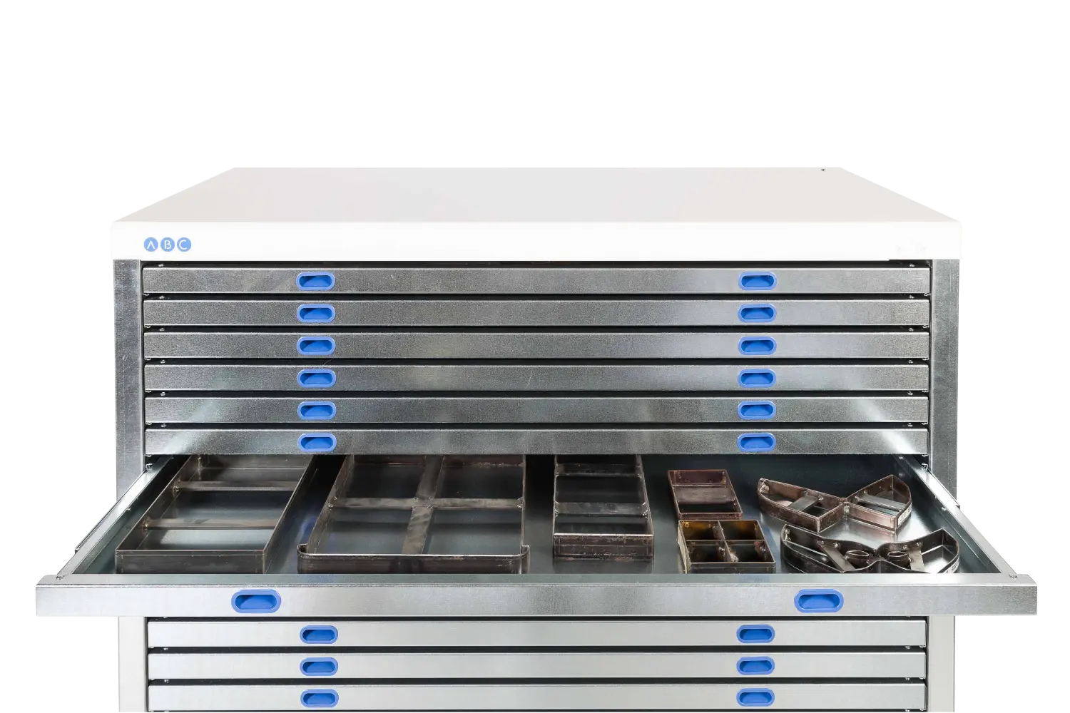 The horizontal cabinet is specially designed to handle frequently used cutting dies. When inserted into the cutting department, the cabinet replaces the existing work surface. The cutter has a sturdy work surface in white painted steel and the drawers containing the die sets used in production.