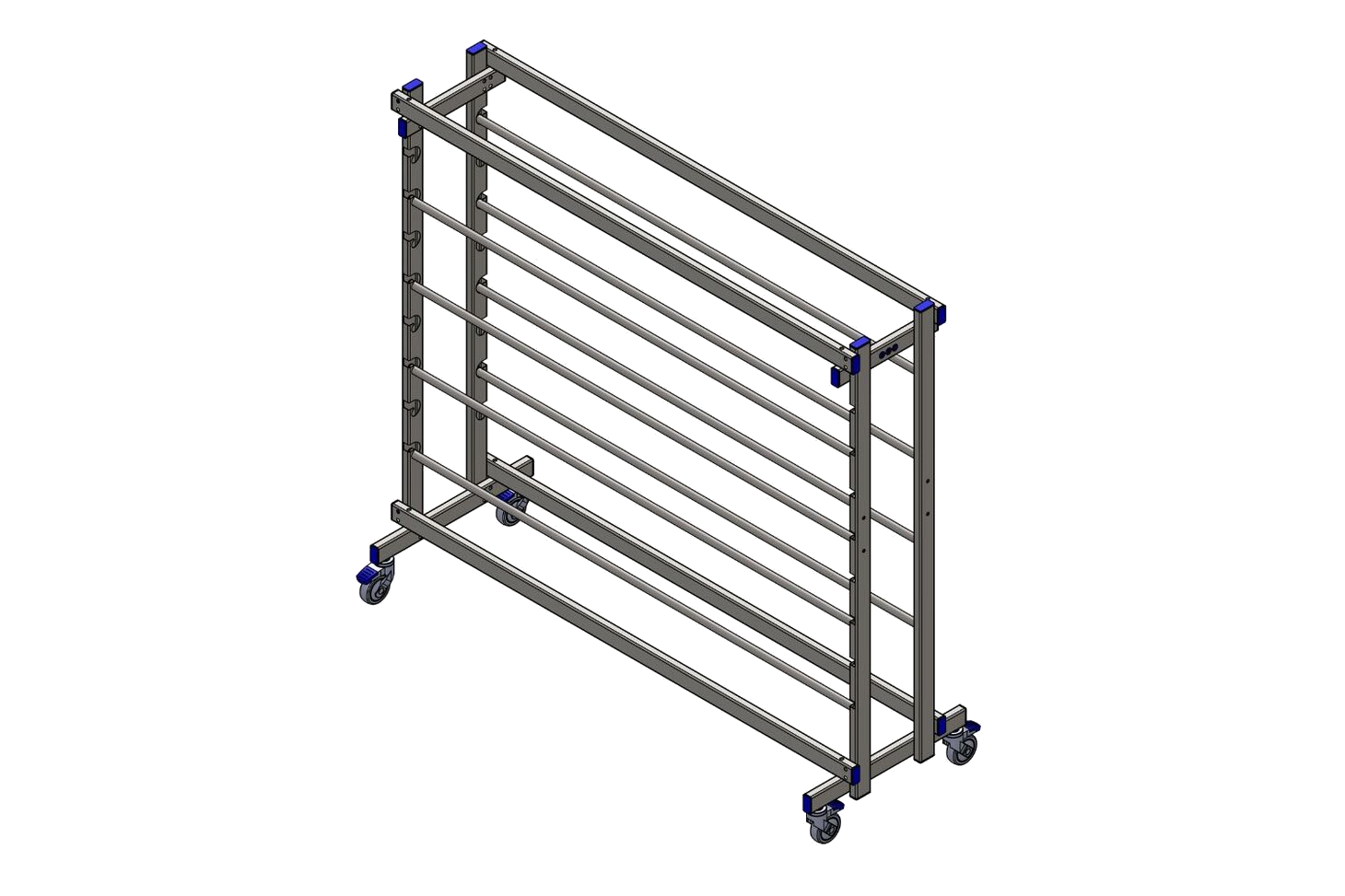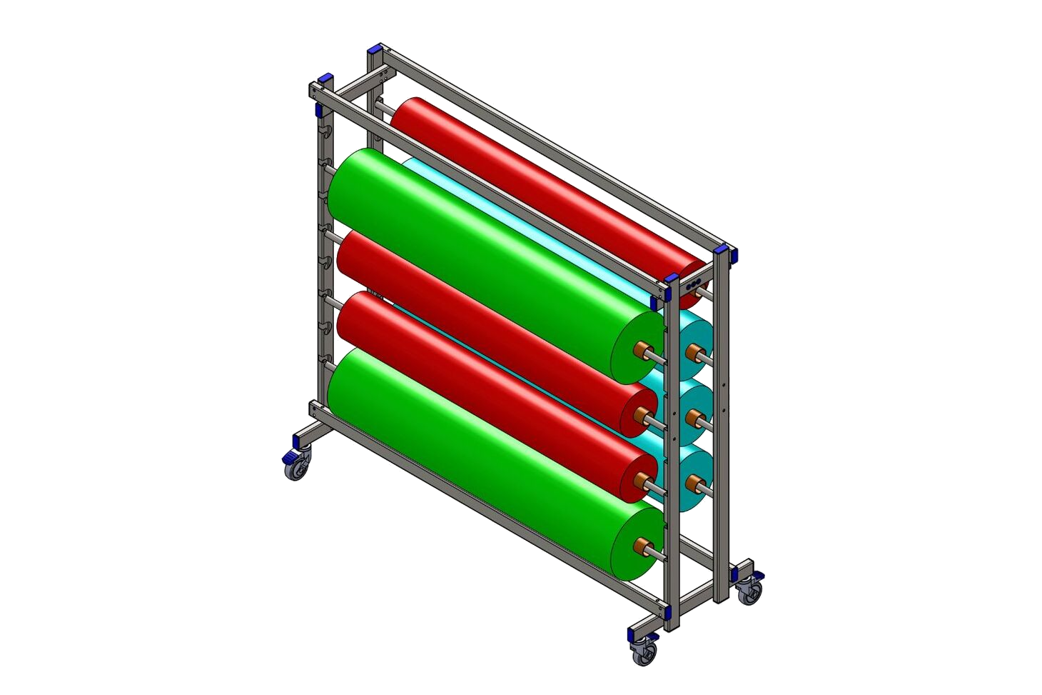 Another example realised is the upholstery roll trolley customised in size to handle rolls larger than standard, such as those used in the automotive sector for car interiors, nautical for yacht interiors and furniture.