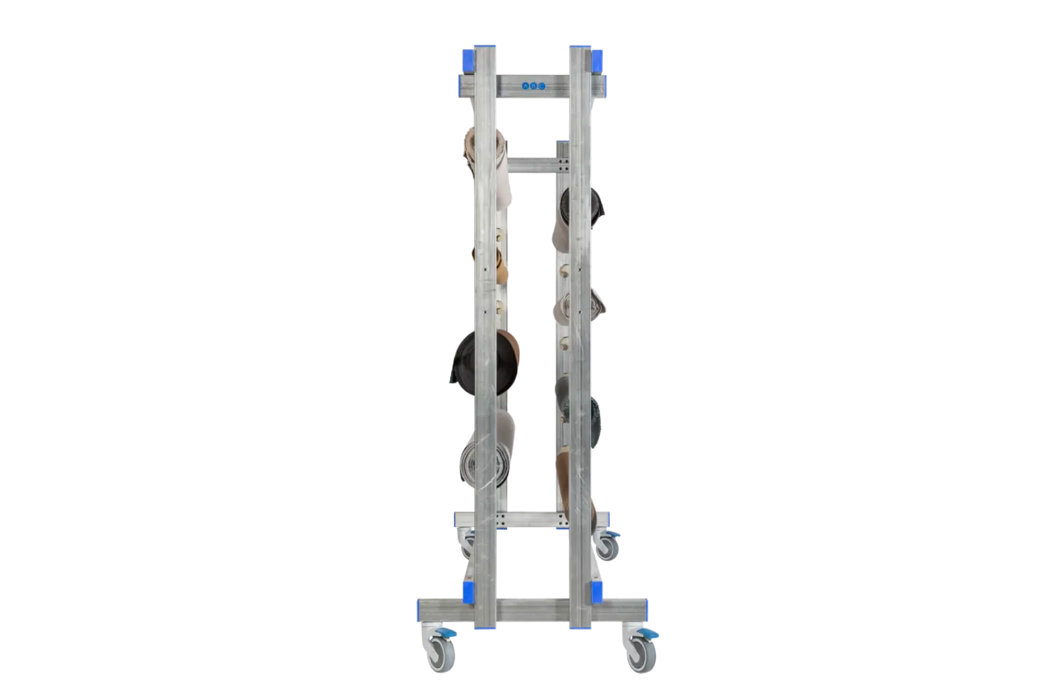 Nuestro carrito portarrollos está fabricado en acero galvanizado y equipado con ruedas anti-hilos con freno para un manejo cómodo en toda la fábrica. Su estructura estrecha permite una fácil maniobrabilidad en los pasillos de los departamentos.