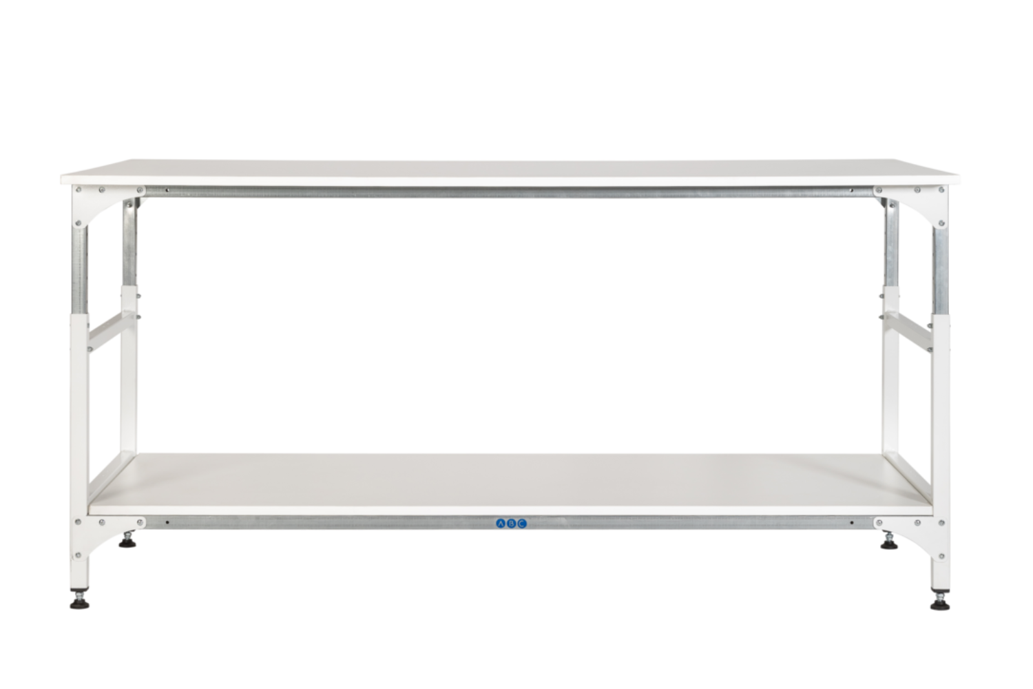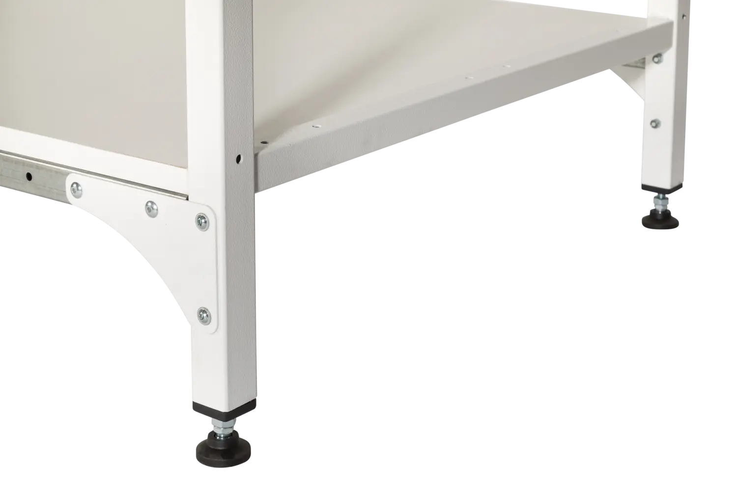 Lo que hace especial a este banco de trabajo es su estante superior regulable en altura que se adapta al operario y al tipo de trabajo. La altura mínima es de 77 cm, hasta un máximo de 110 cm.