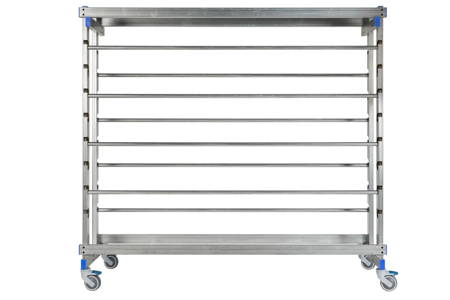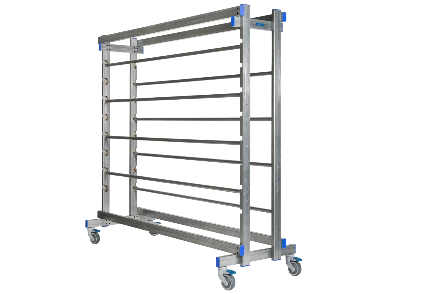 Le chariot est équipé de 8 tubes en acier disposés sur 2 côtés de manière asymétrique pour manipuler des rouleaux d’un diamètre jusqu’à 300 mm.